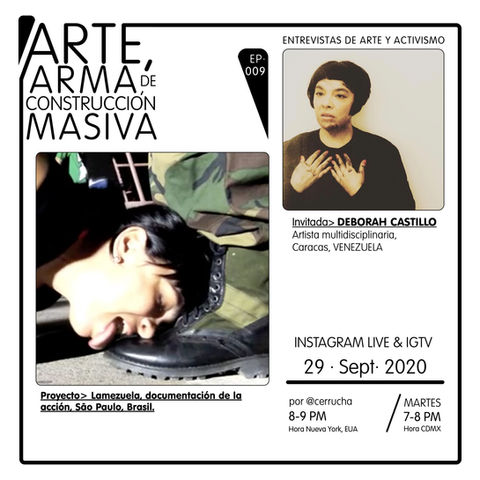 Arte, arma de construcción masiva (AACM) es un programa de entrevistas en Instagram Live e IGTV, que establezco como conductora, y que conecta a artistas del Sur Global que trabajan desde la práctica social (arte activista). En este espacio, comparten sus proyectos, estrategias y contextos. Surgió durante la pandemia de COVID-19 como respuesta a la necesidad de superar las barreras impuestas por la distancia y fomentar el encuentro, aunque la inquietud por escucharnos e intercambiar ideas existía mucho antes.